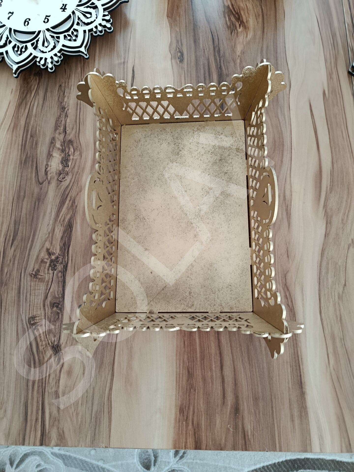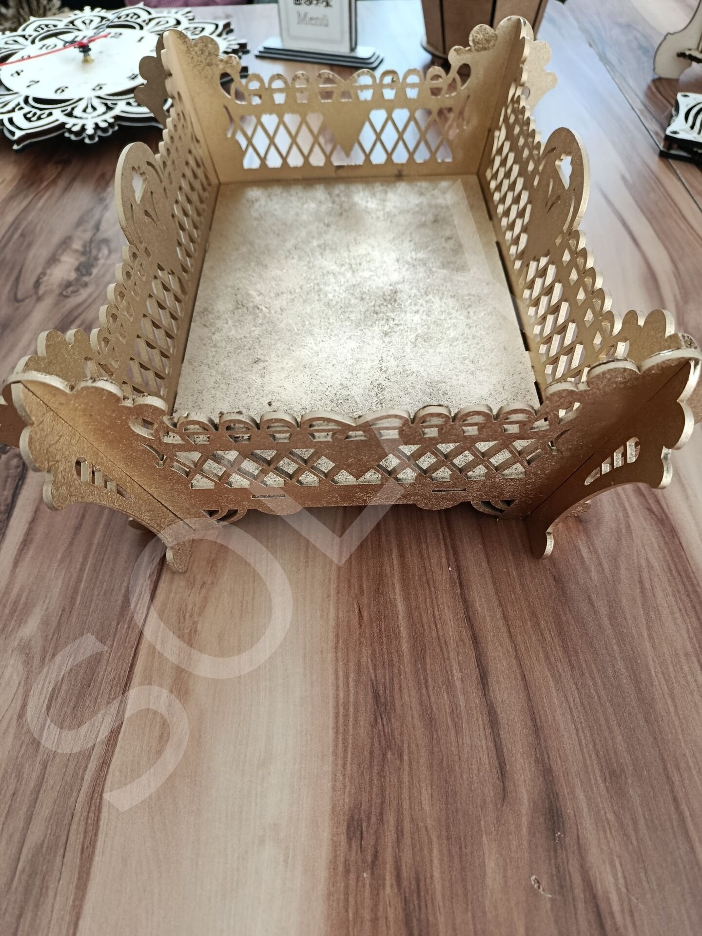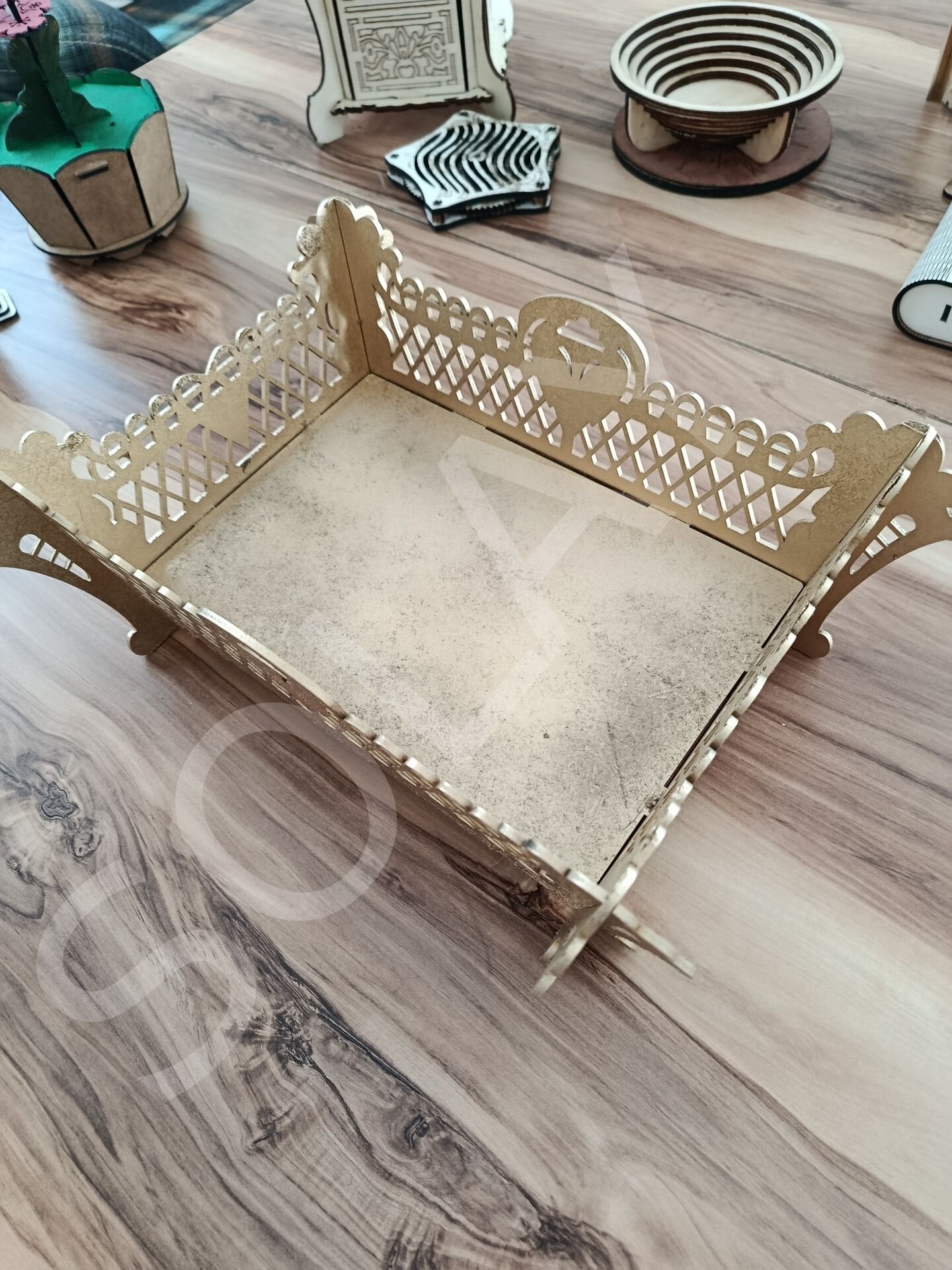 3mm MDF sepet tepsi. yaldız boyalı 30x25 ölçülerinde. ürün orta tablasına dilerseniz isim veya logonuzu çizdirebilirsiniz