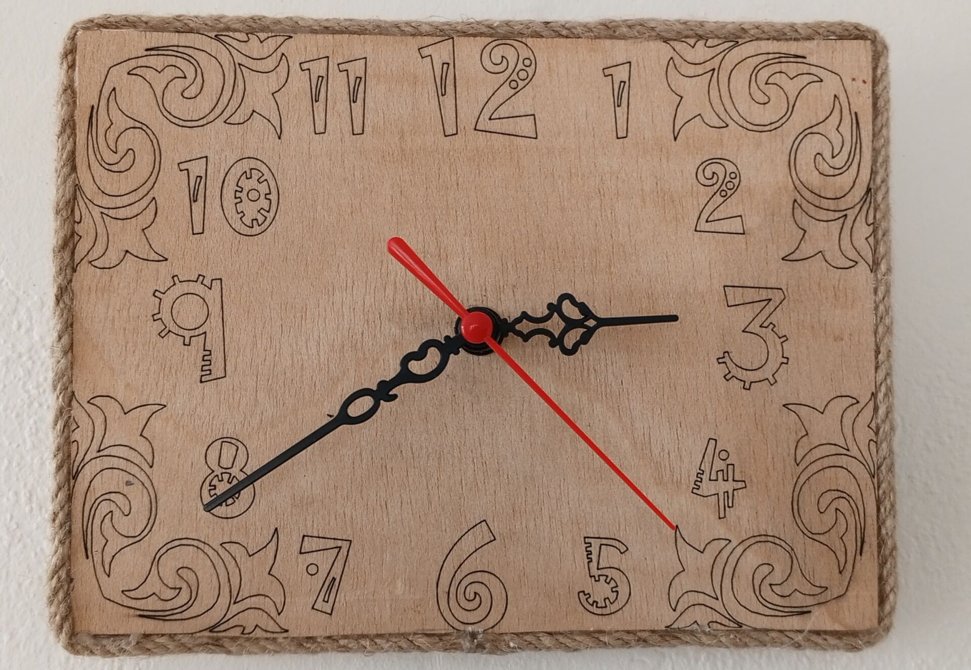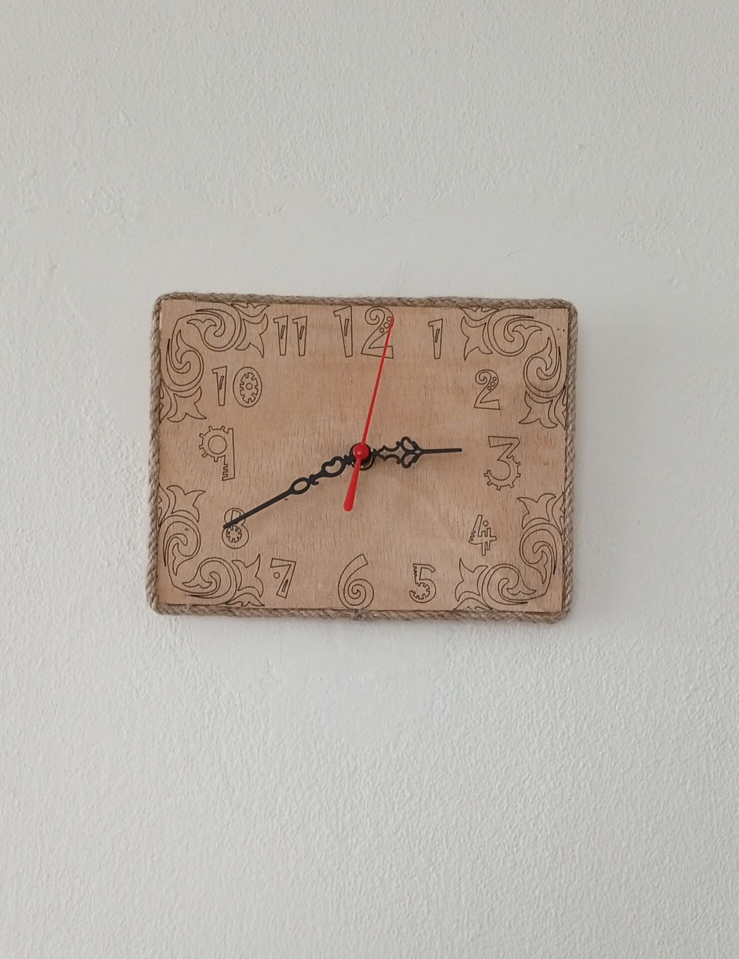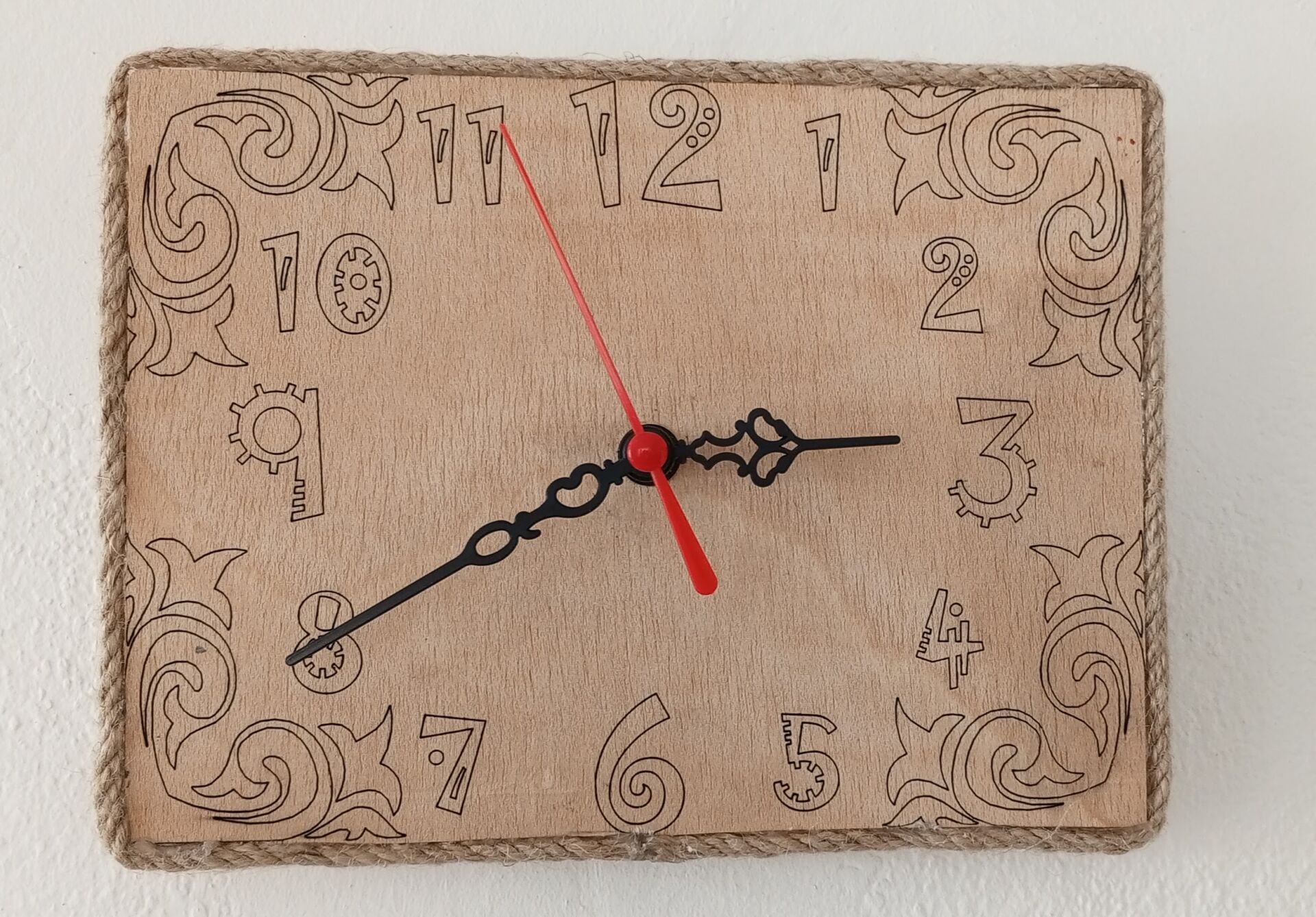 23x17 cm ölçülerinde ahşap üzerine lazer yakma yapılmiş süslü rakamlar ve köşe süslü sessiz duvar saati