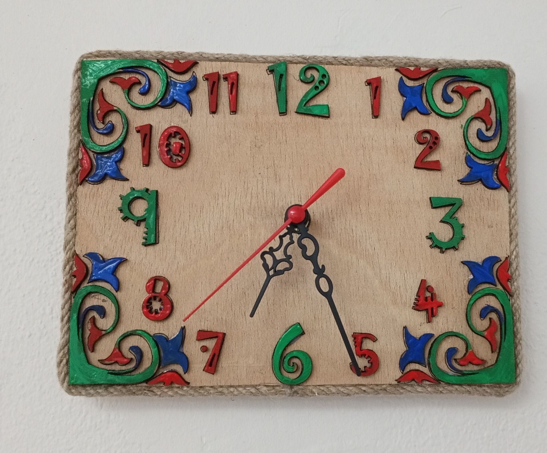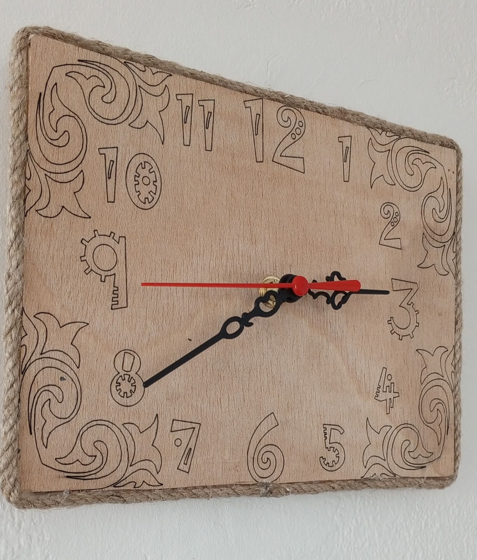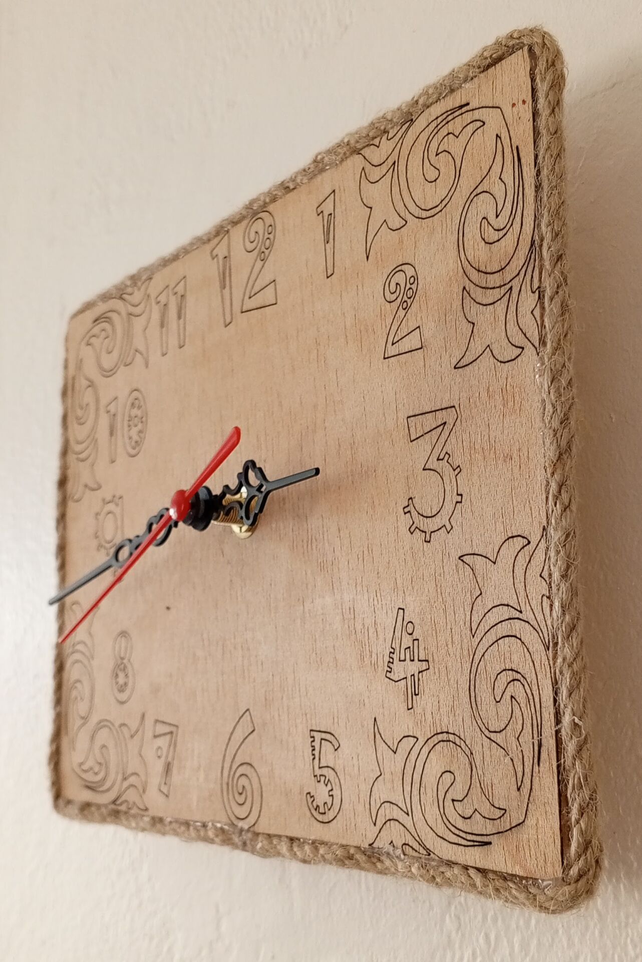 23x17 cm ölçülerinde ahşap üzerine lazer yakma yapılmiş süslü rakamlar ve köşe süslü sessiz duvar saati