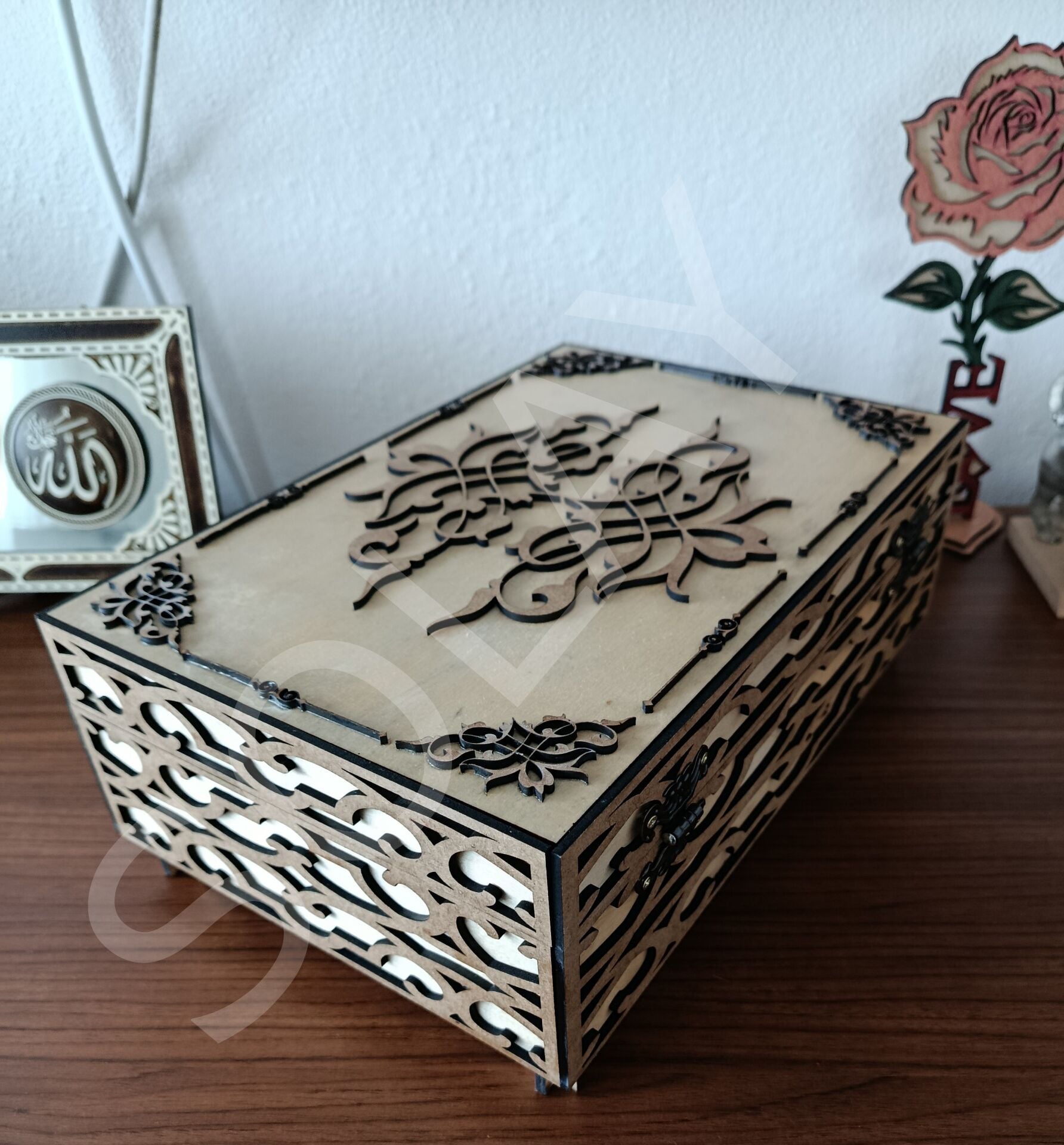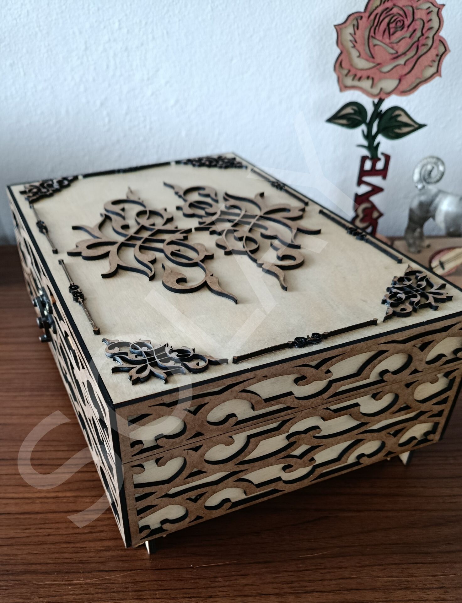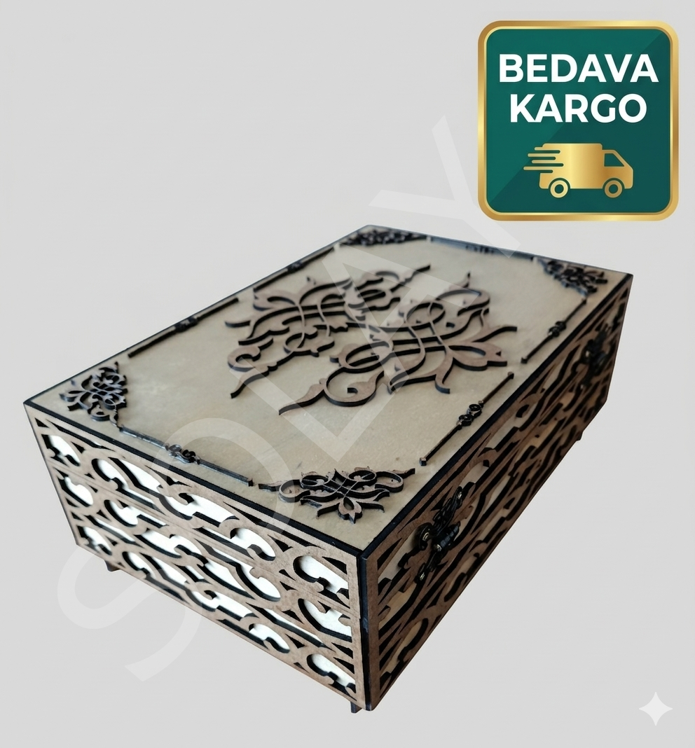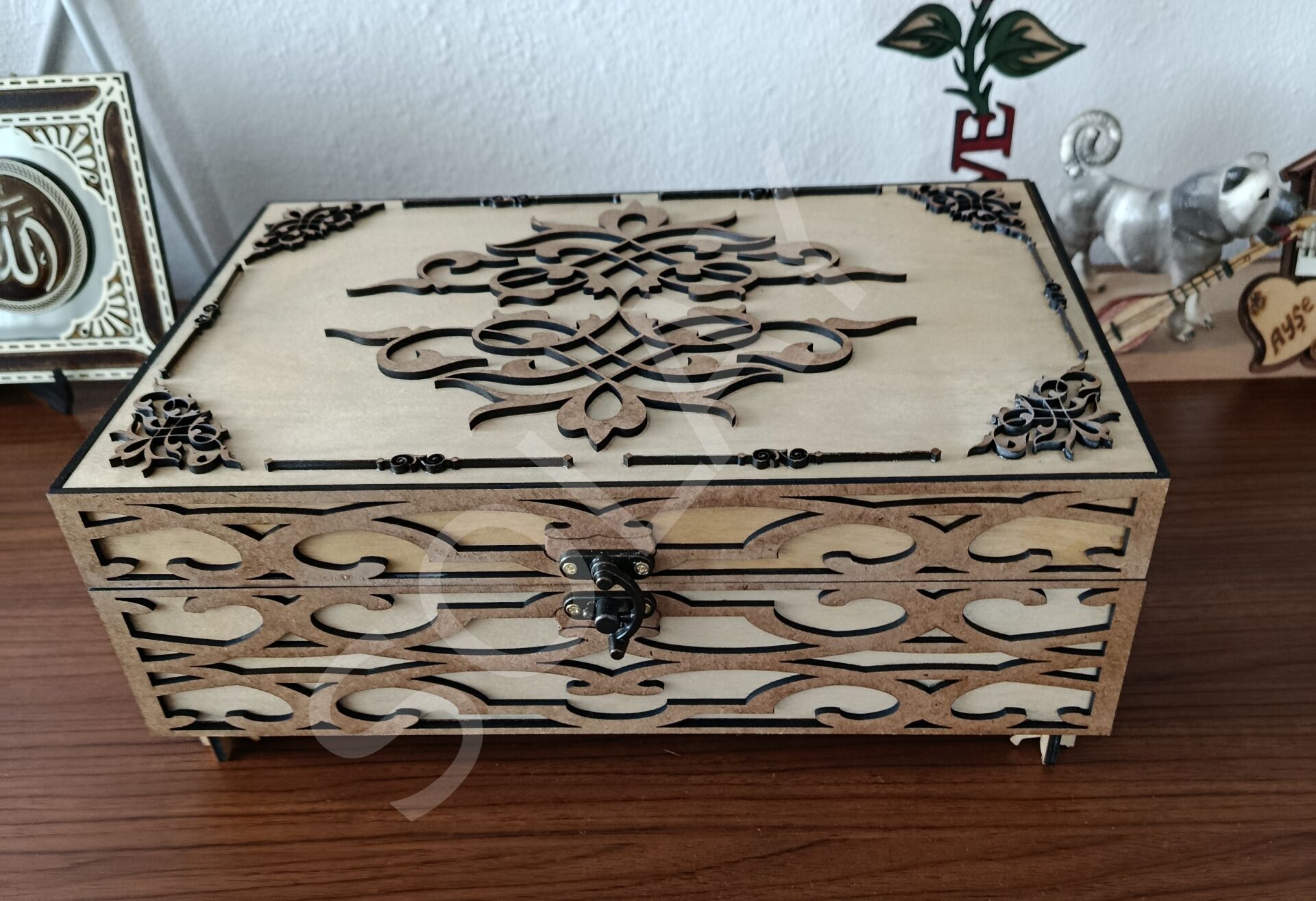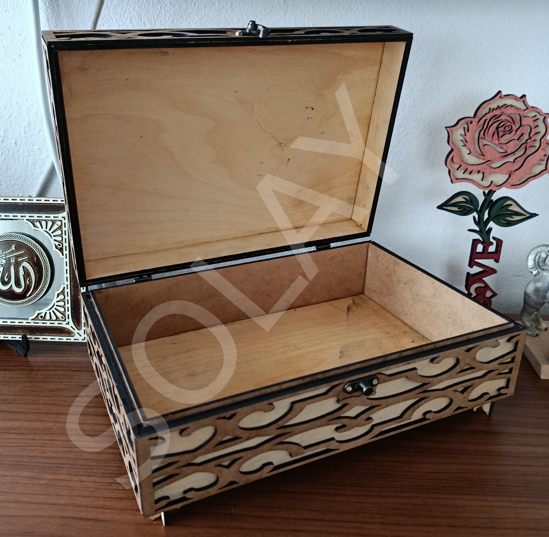 Mdf ve kontraplak malzemeden üretilmiş, kabartmalı motiflerle süslenmiş kilitli, ayaklı, boyanabilir ve kişiselleştirilebilir hediyelik ahşap sandık kutu, zarif yapısı ile özel anlarınızı saklamak için ideal. Şık tasarımı sayesinde dekoratif amaçlı da kullanılabilir, sevdiklerinize anlamlı hediye seçeneği sunar. İsterseniz sandık üzerine yazı talep edebilirsiniz, yazılacak yazıyı aynı şekilde kabartma olarak yapmaktayız. Olduğu gibi talep ederseniz yazılacak yazı kısmına lütfen BOŞ yazınız