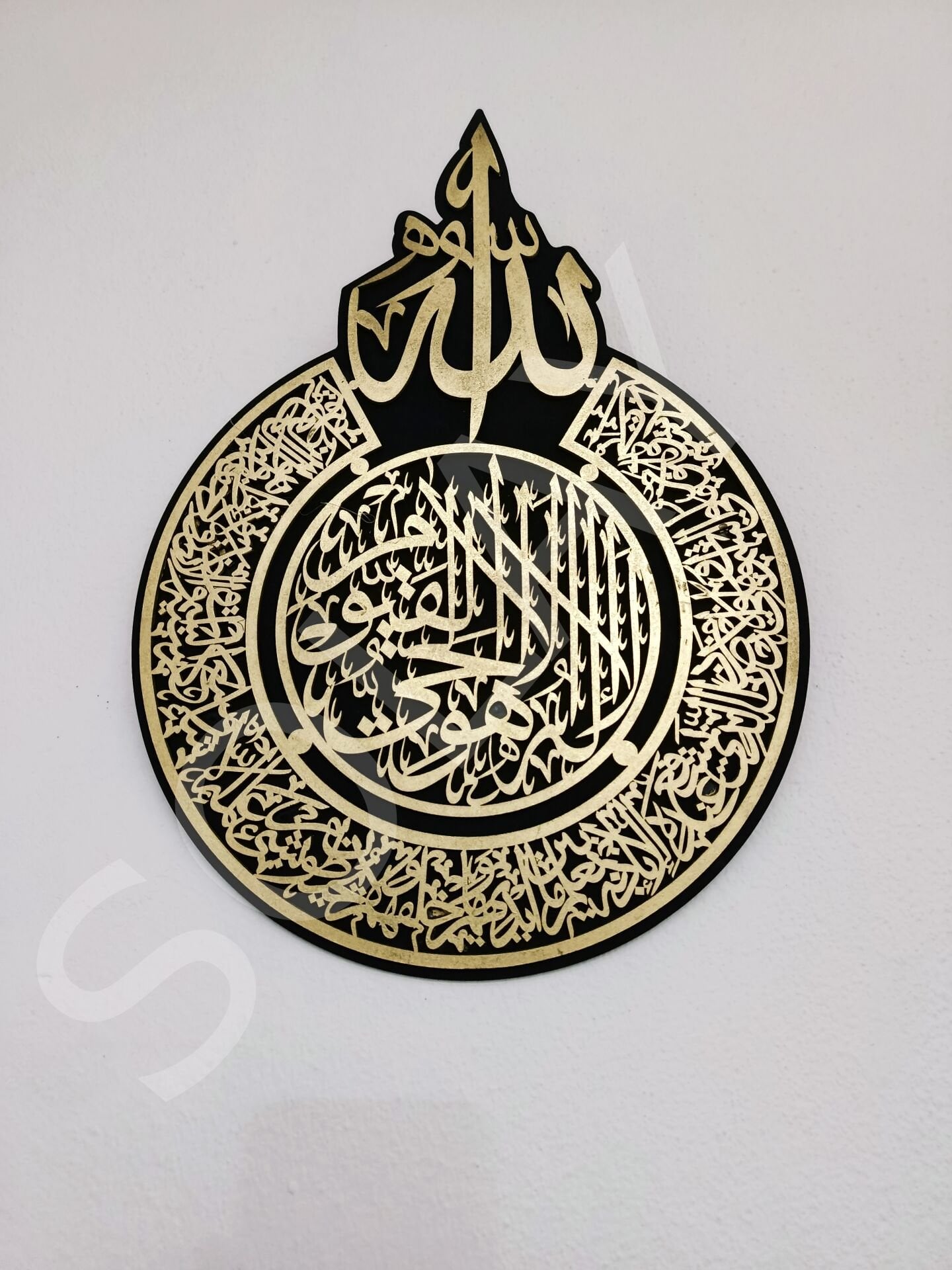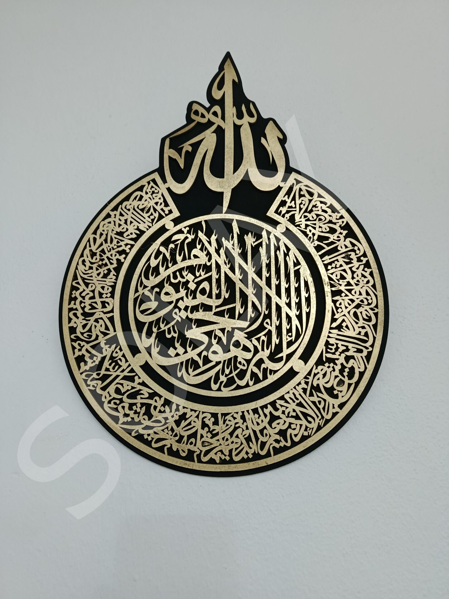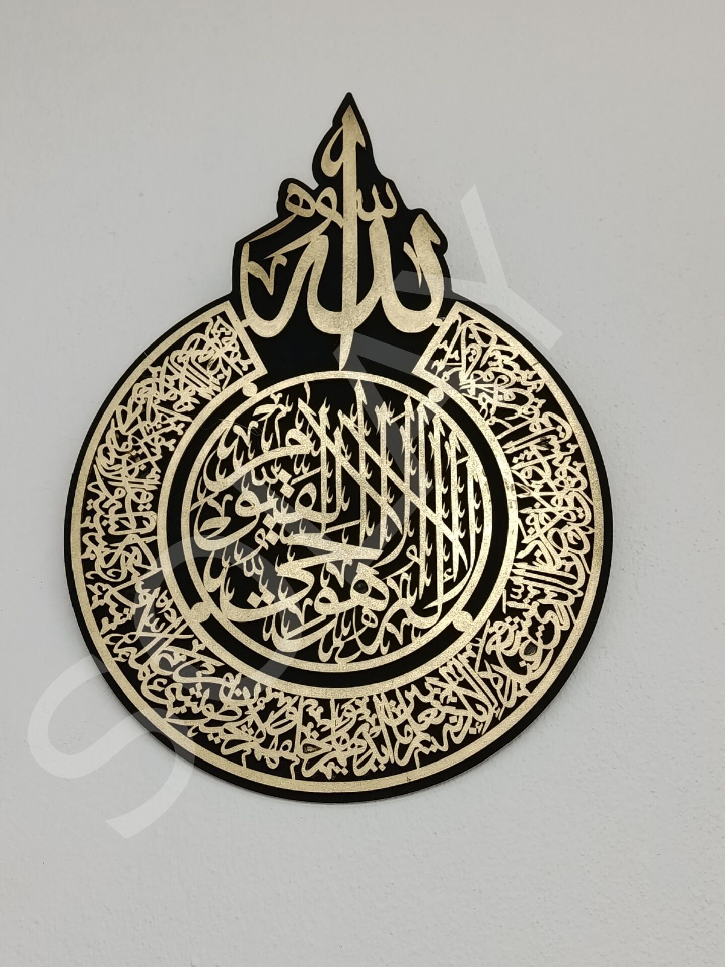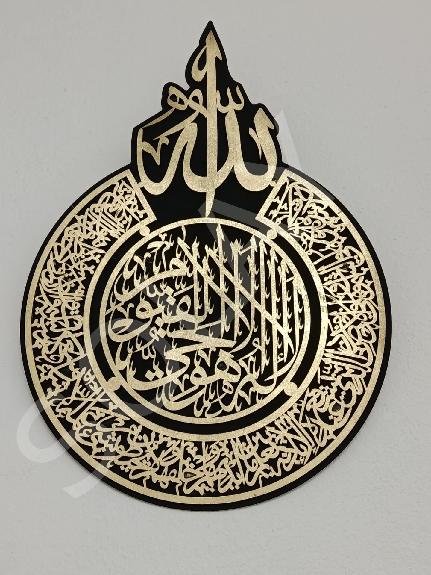 41 x 30 ölçülerinde Ayetel Kürsi duvar panosu 3mm MDF den imal edilmiş, siyah üzerine yaldız kabartma yazılı bu zarif ve şık duvar panosu sevdiklerinize hediye olarakta sunabileceğiniz, odanızı ve işyerinizi renklendirecektir.