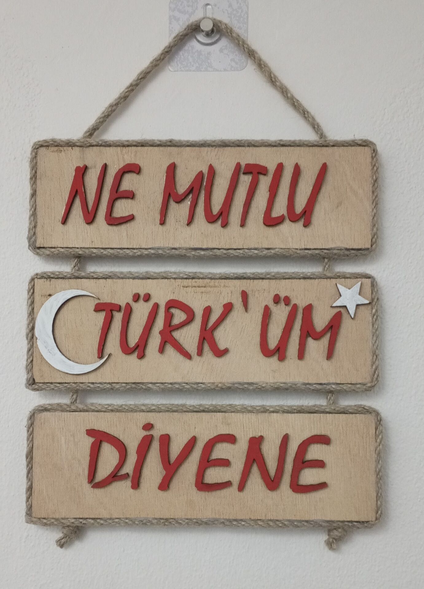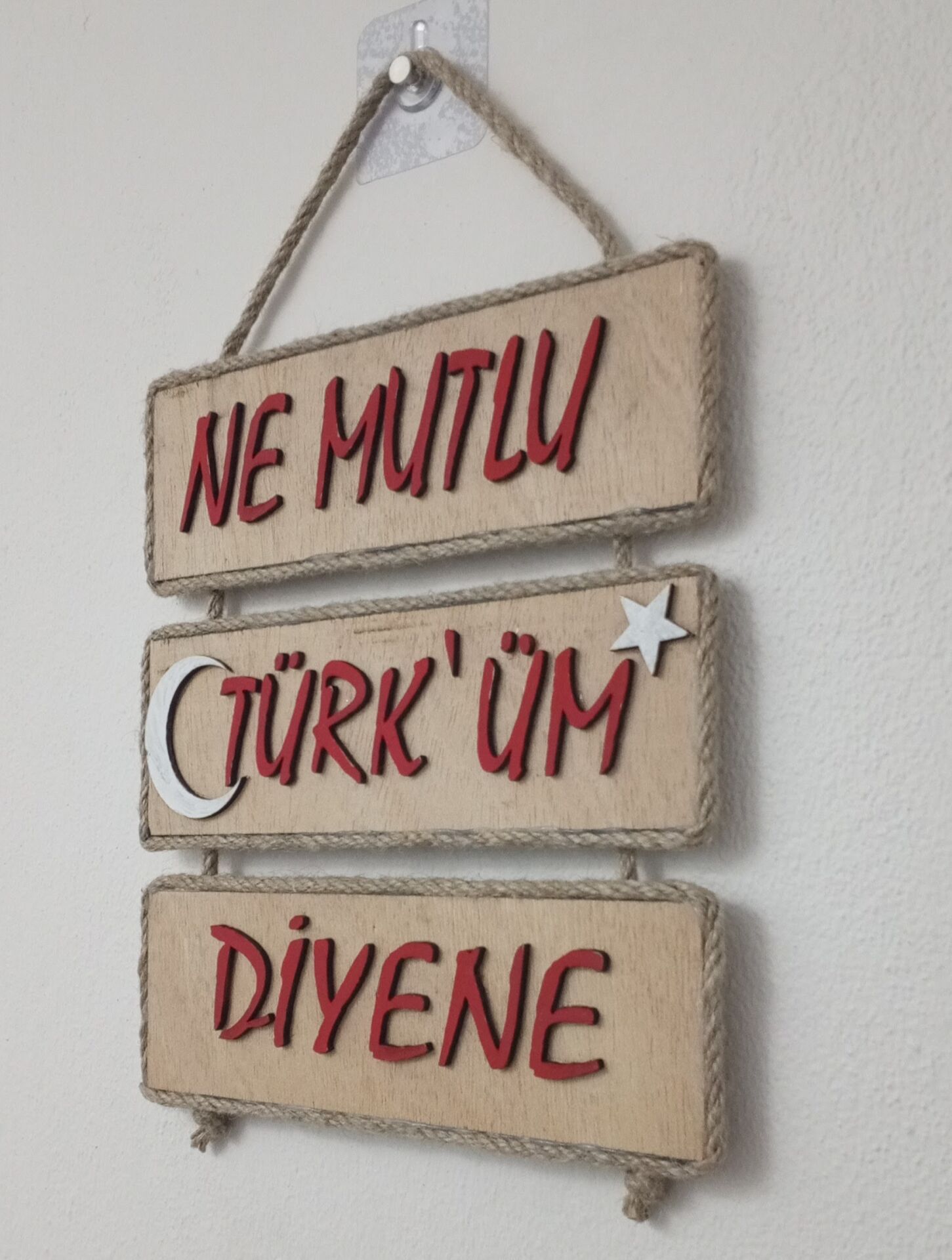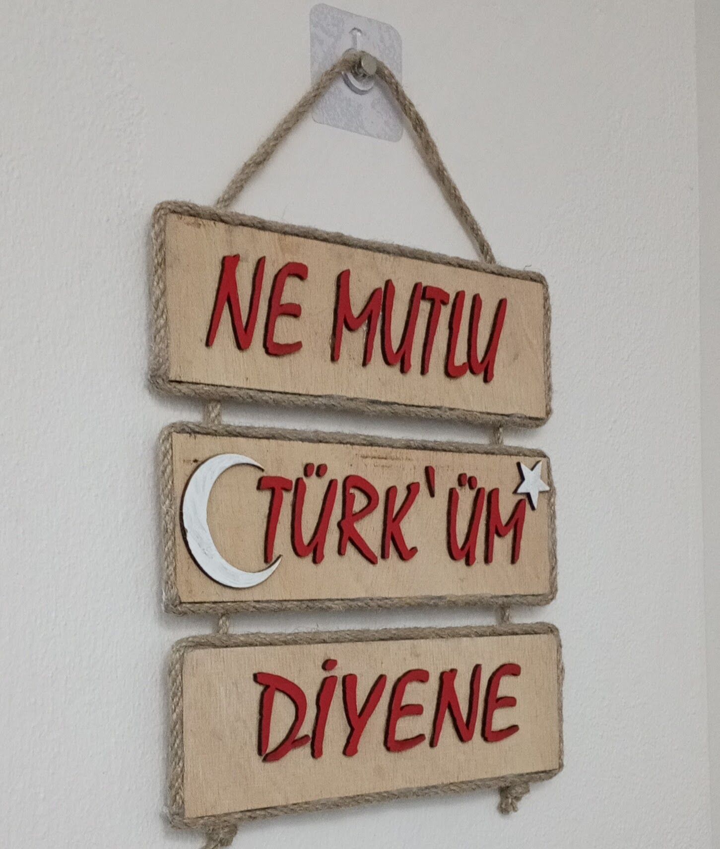 26cm x 22cm ölçülerinde,Tabii! Ahşap ve jüt ip kombinasyonuyla el yapımı duvar süsü evinize geleneksel bir dokunuş katacak. Ürün, Türk bayrağının sembolik renkleriyle dikkat çekici bir dekorasyon parçası olacak. Evinizin herhangi bir odasına asabilirsiniz.