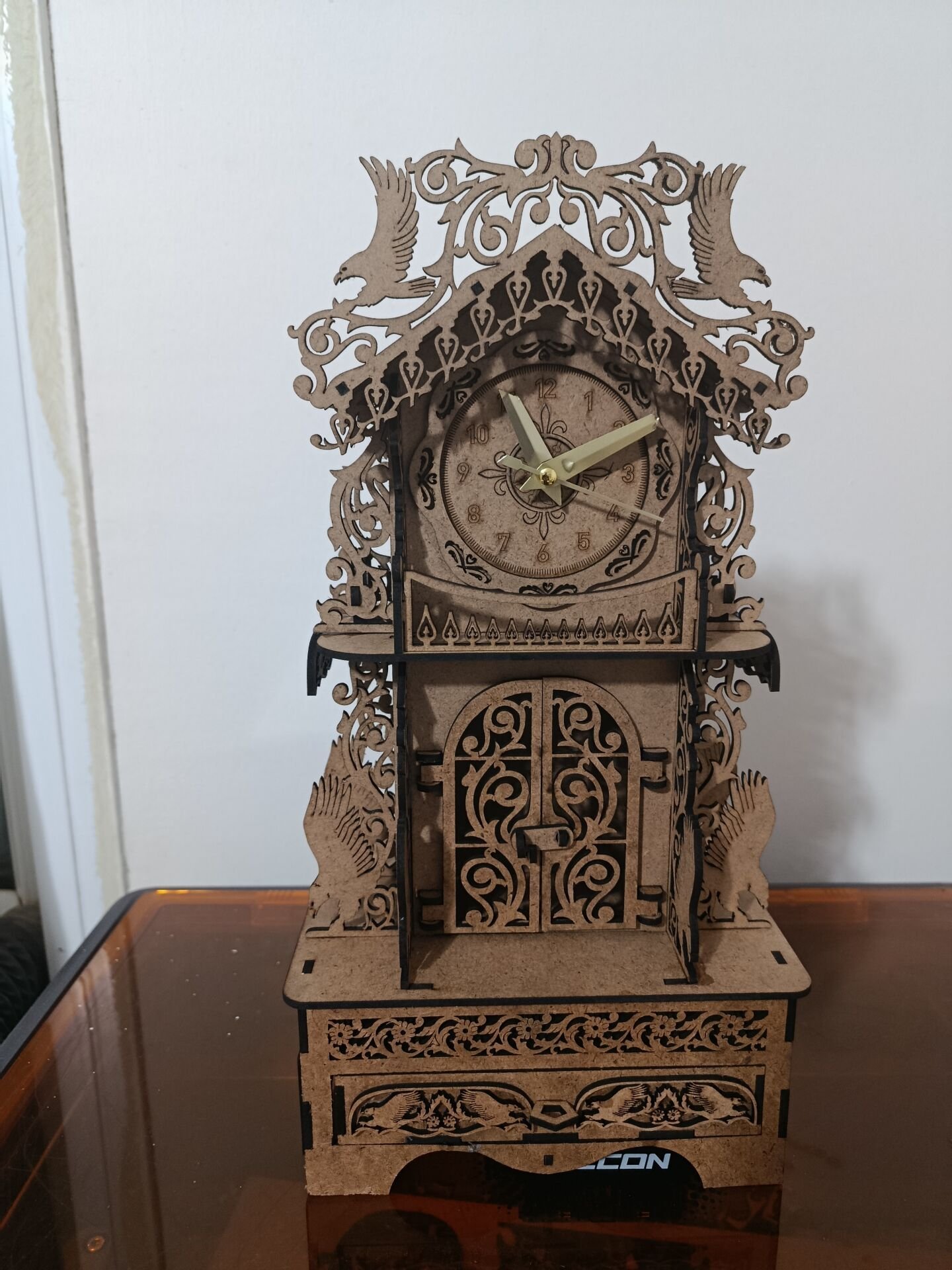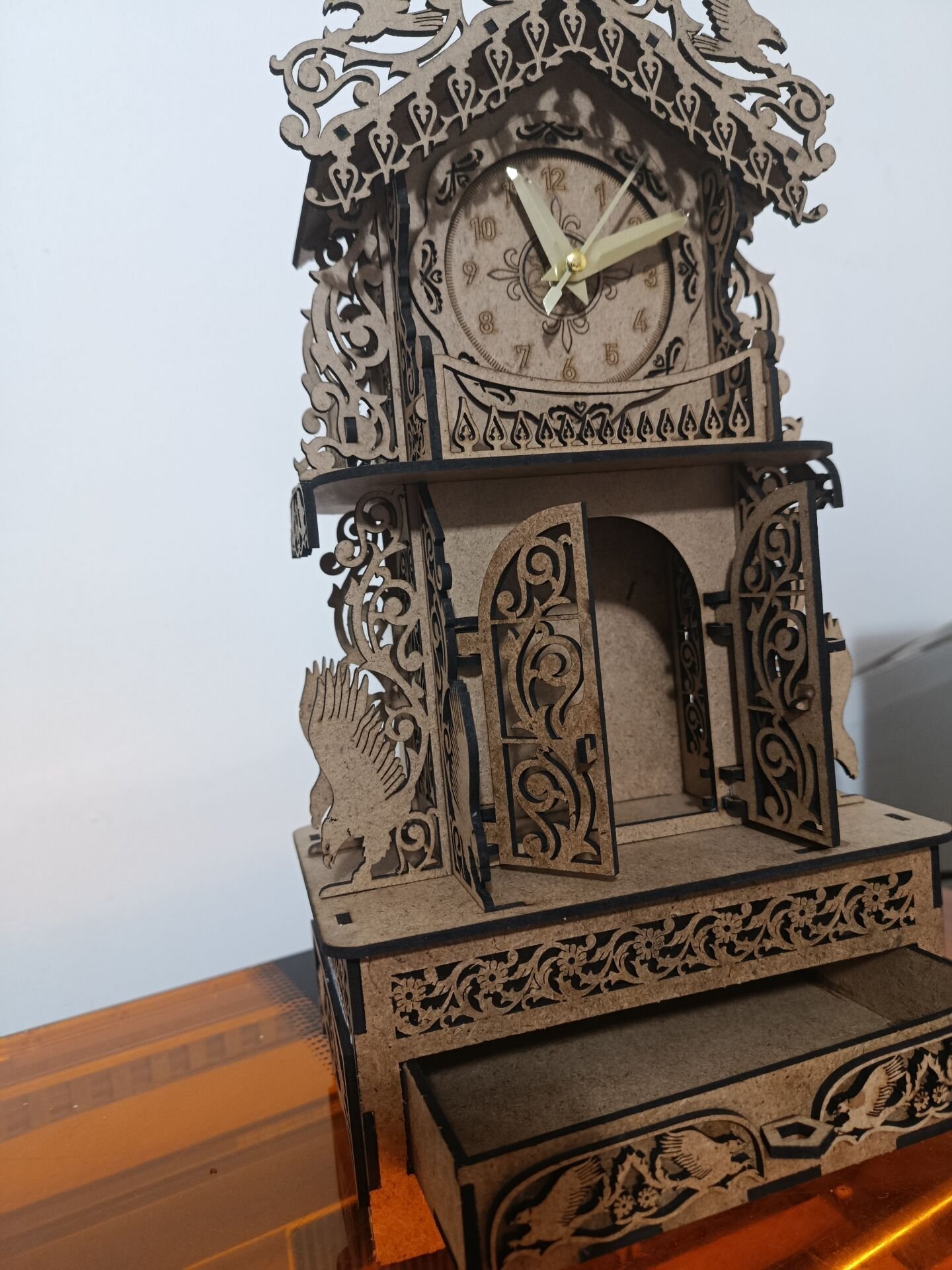 3mm MDF malzemeden üretilmiş bu gotik tarz kartal figürlü masaüstü saat, zarif çekmecesiyle hem dekoratif hem işlevsel. Estetik detayları ve sağlam yapısı ile çalışma masanıza karakter katarken, çekmecesi küçük eşyalarınızı düzenli tutmanıza yardımcı olur. Farklı ortamlara şıklık katar.