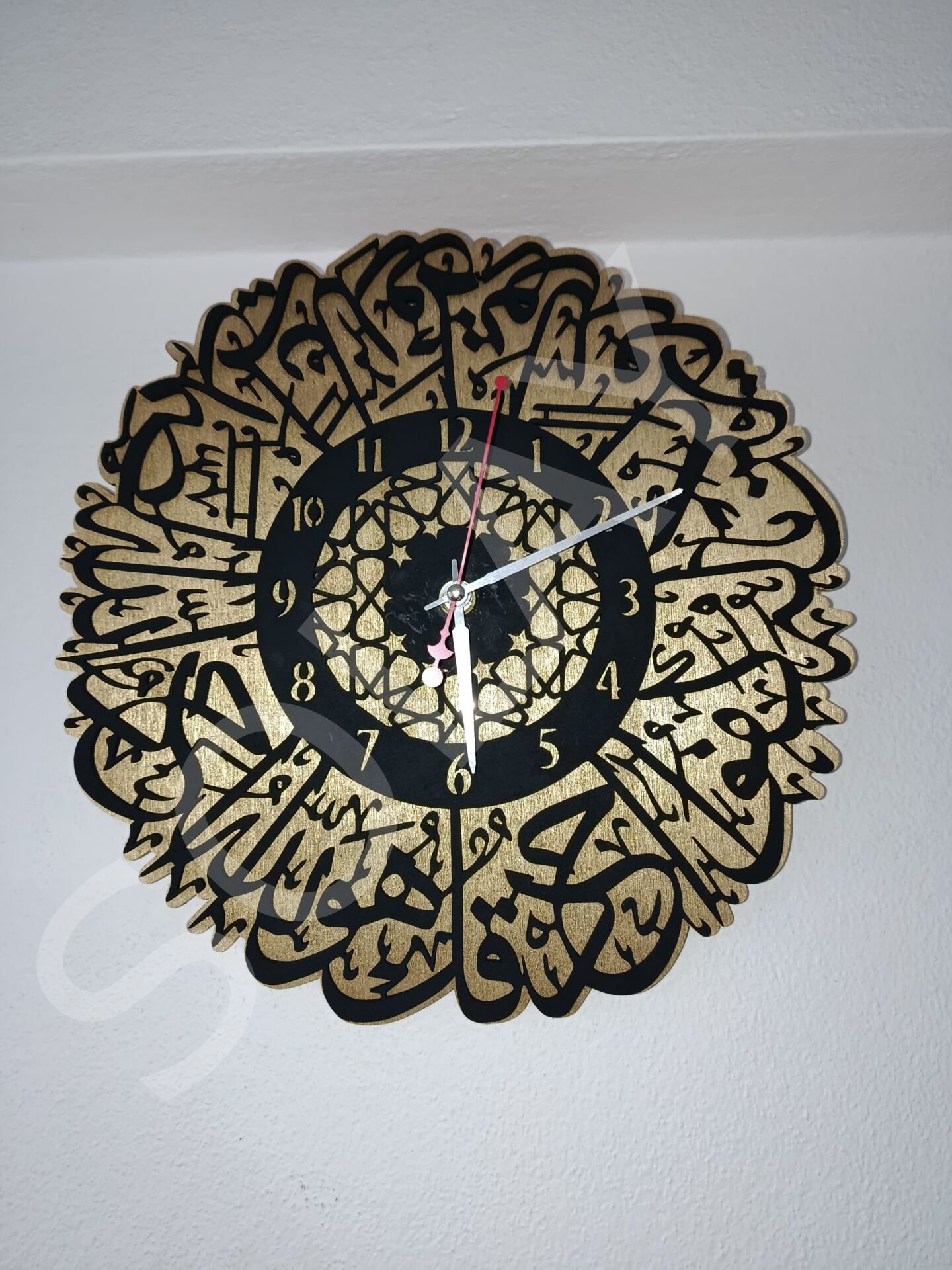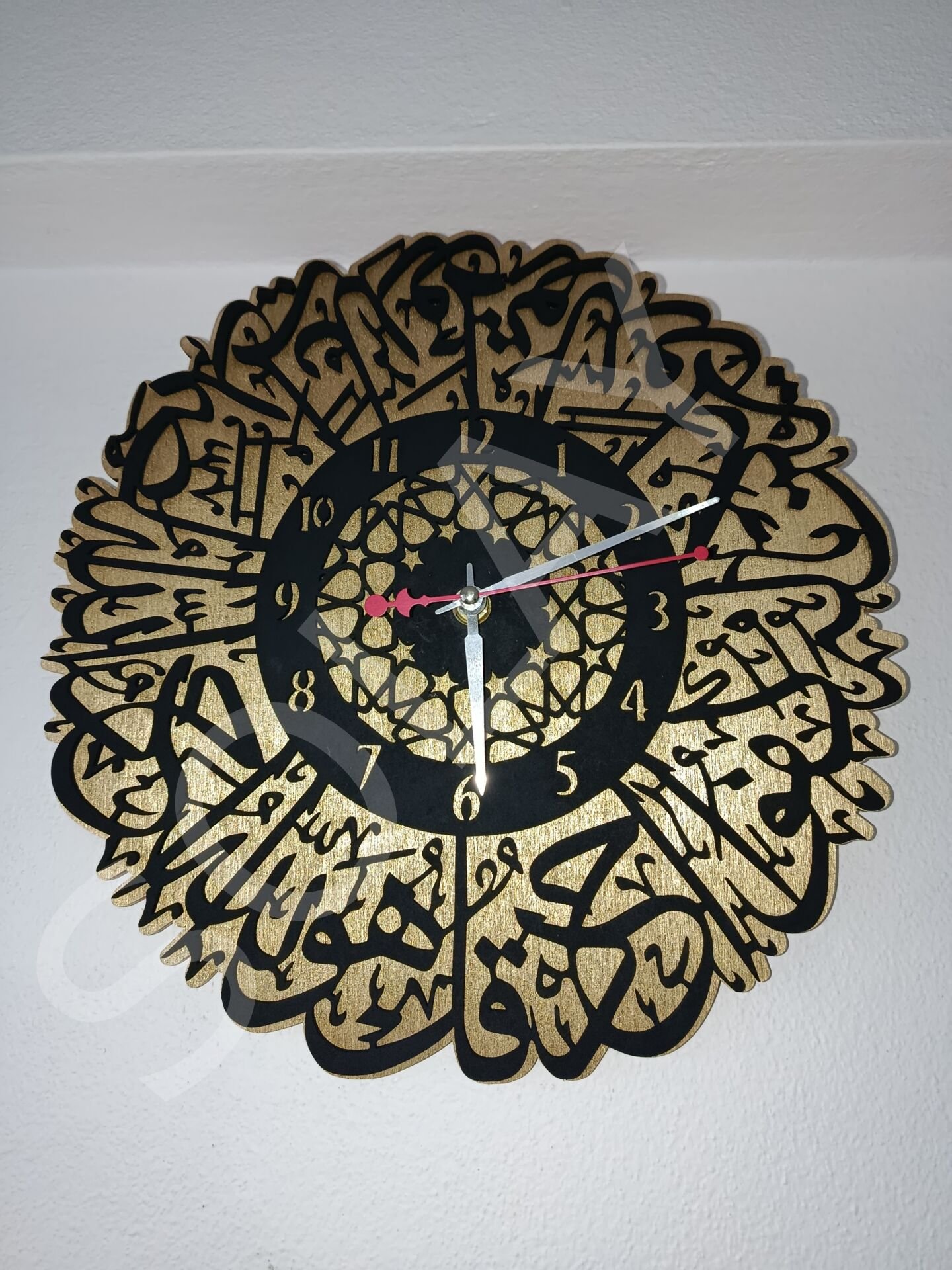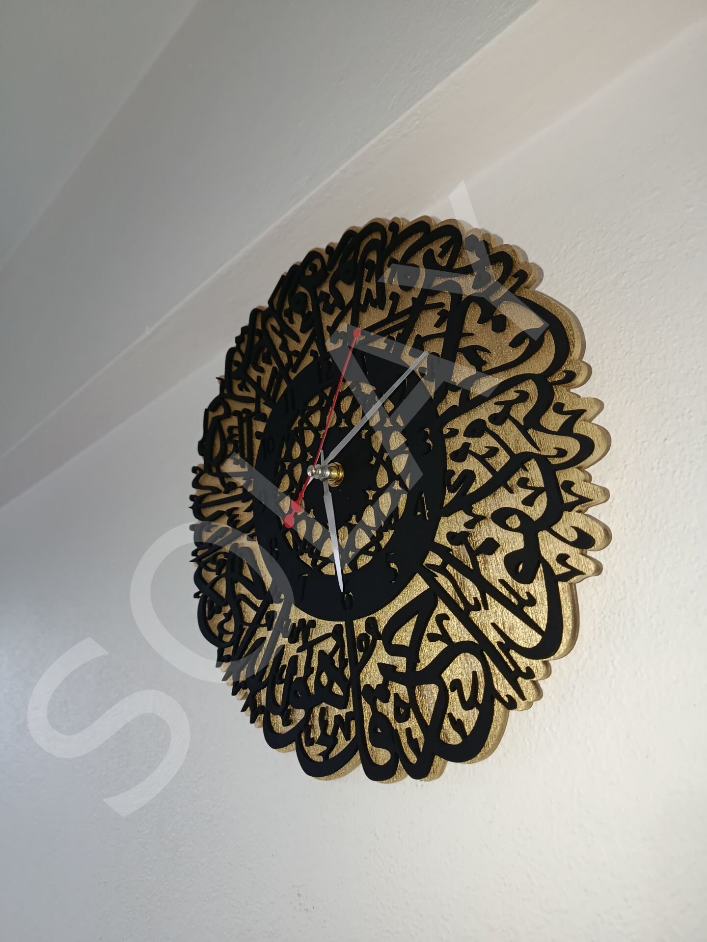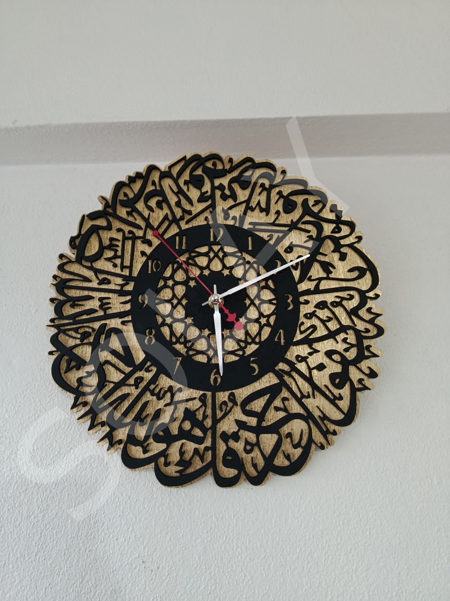 Lazer Kesim İslami Dekoratif Ahşap Duvar Saati - İhlas Suresi İşlemeli Gold Detaylı
