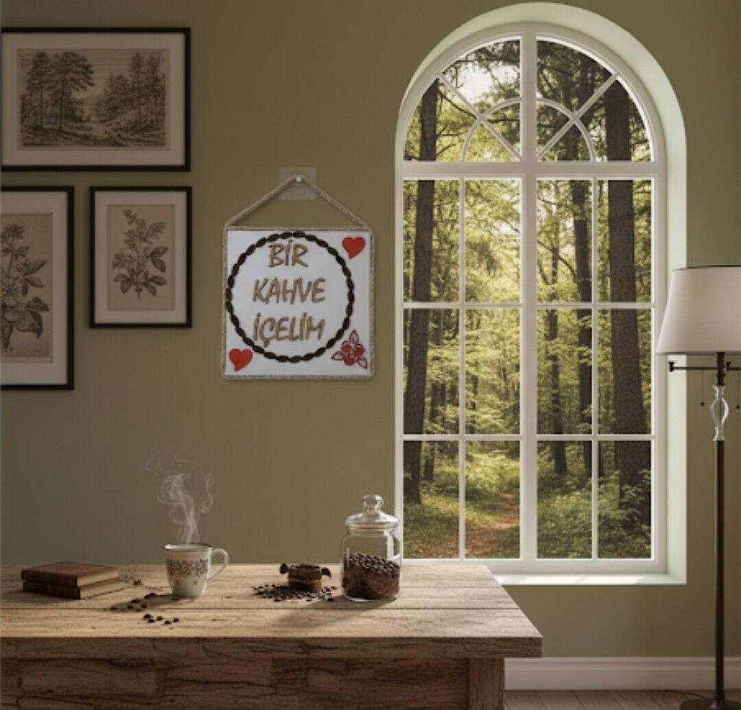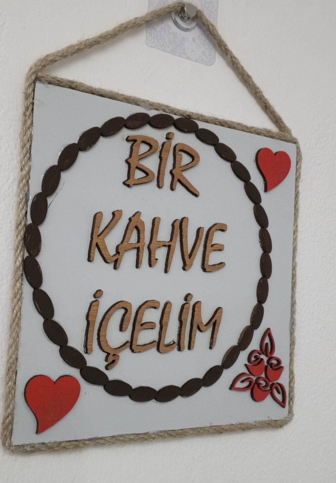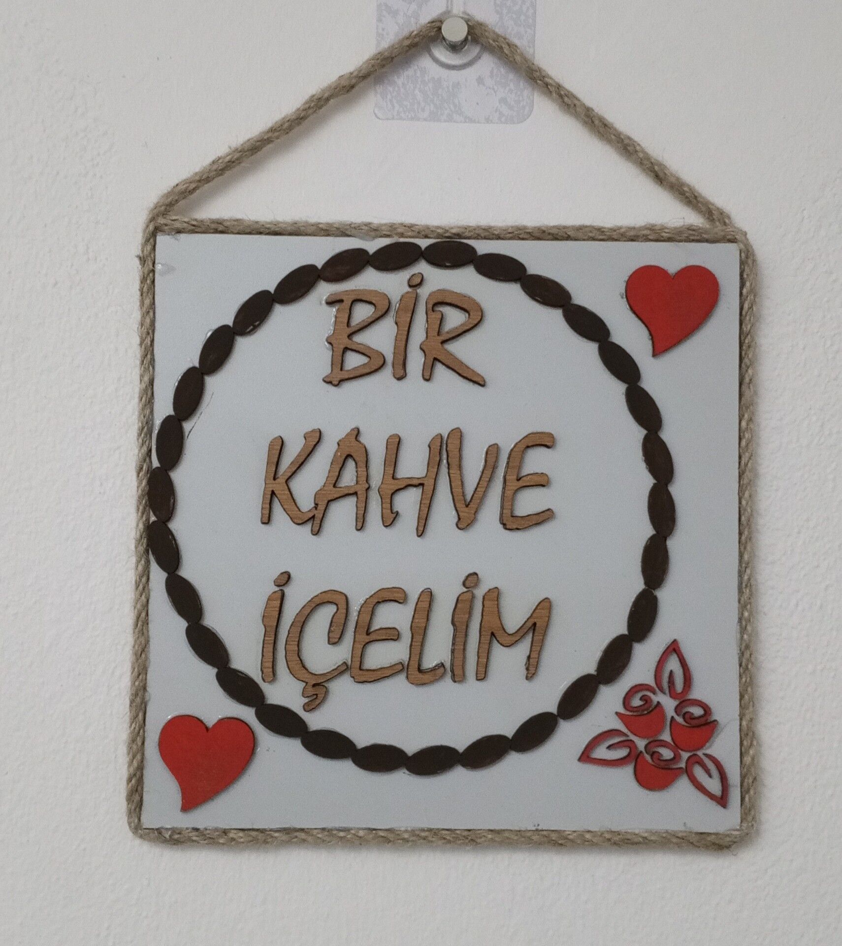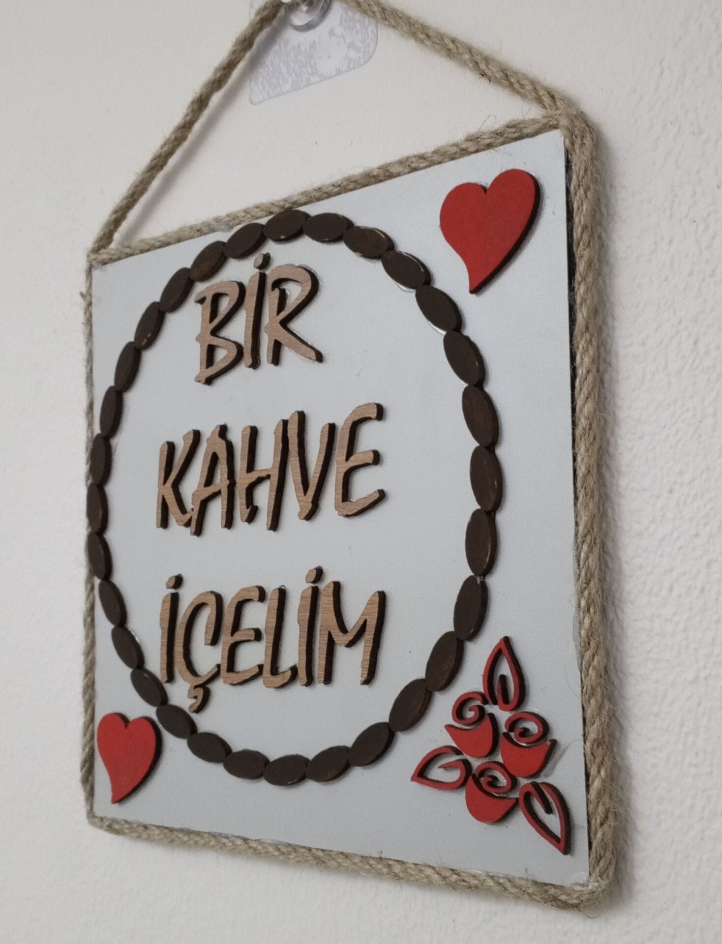 21cm x 21 cm ölçülerinde ahşap üzerine ahşap harf ve şekilerle süslenmiş kahve severler için hediye edilebilecek duvar panosu