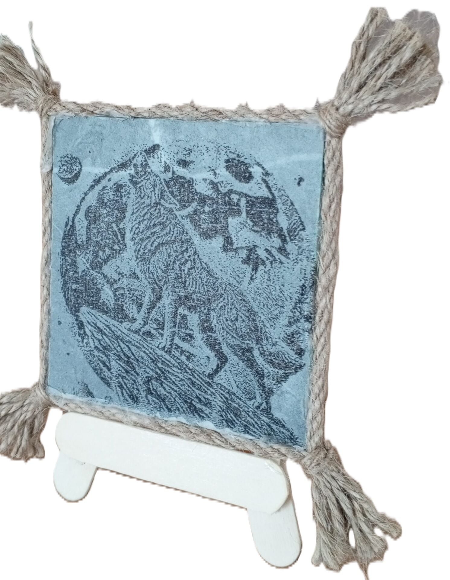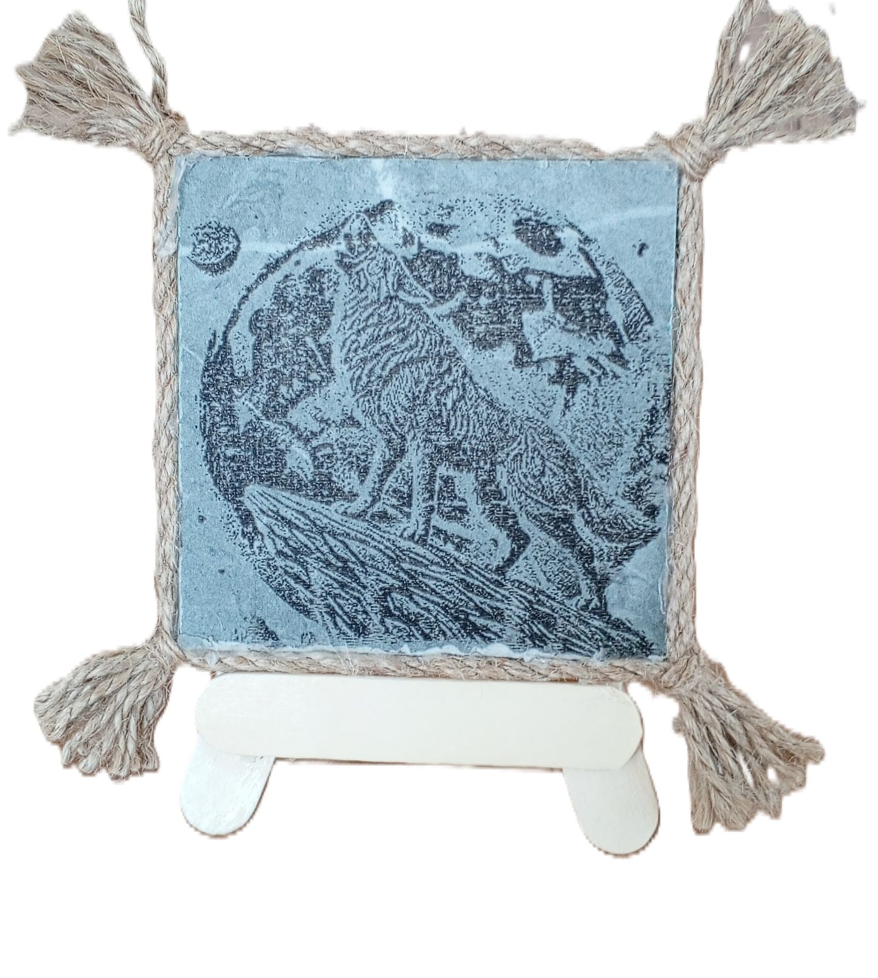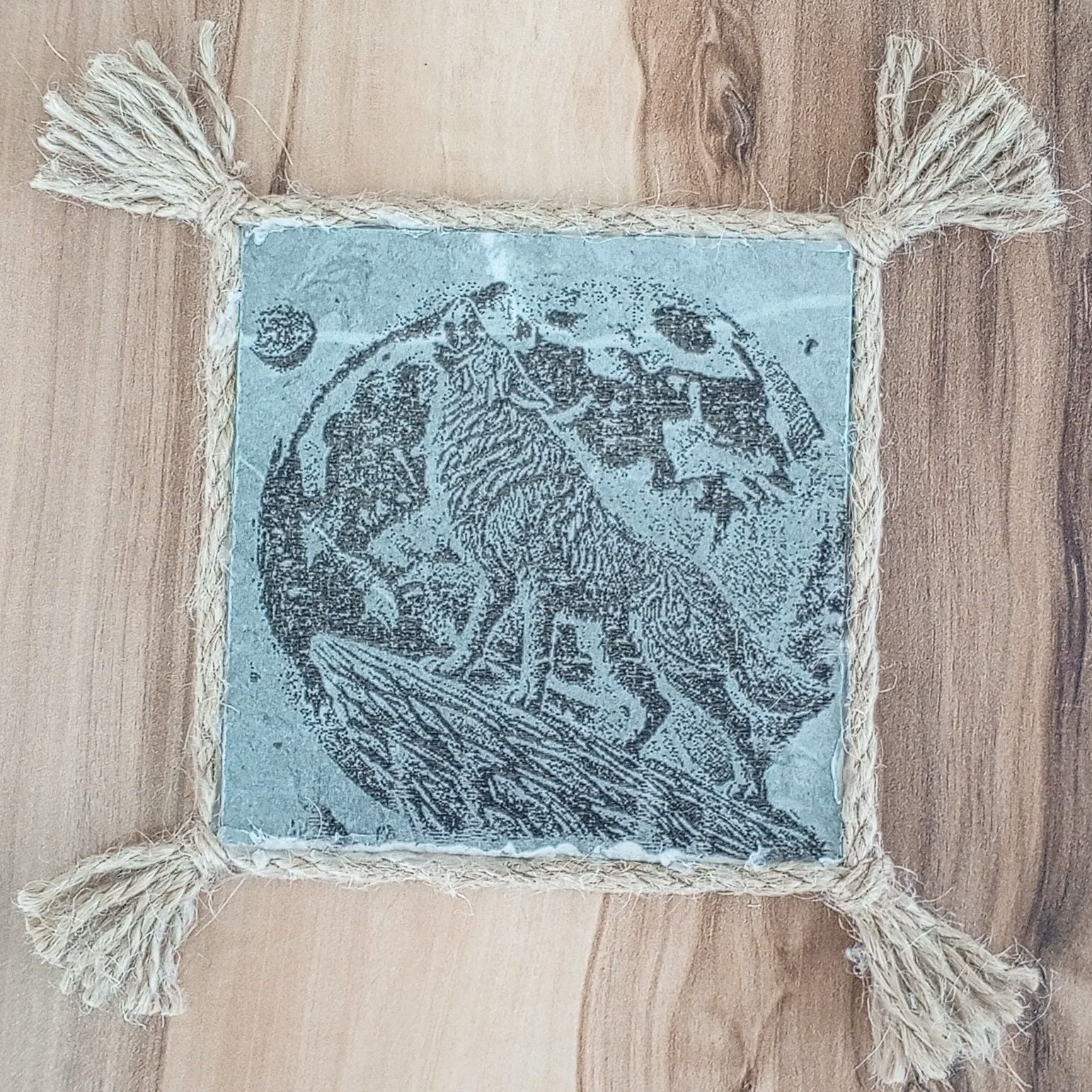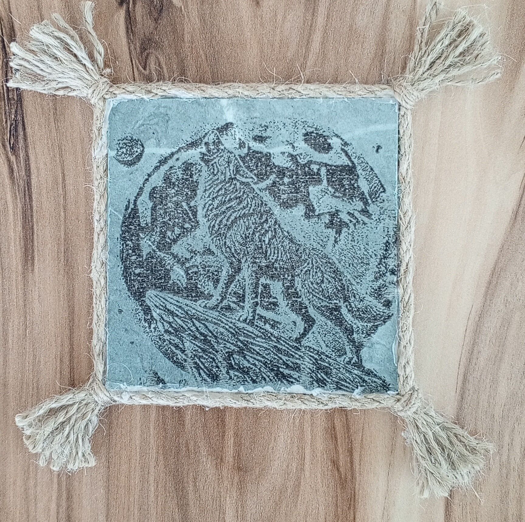 10cm x10cm ince mermer üzerine lazer yakma dolunayda uluyan kurt resmi. kenarı jüt ipi ile çevrilmiş ister süs eşyası ister şık bir bardak altlığı olarak kullanabileceğiniz şık bir tasarım