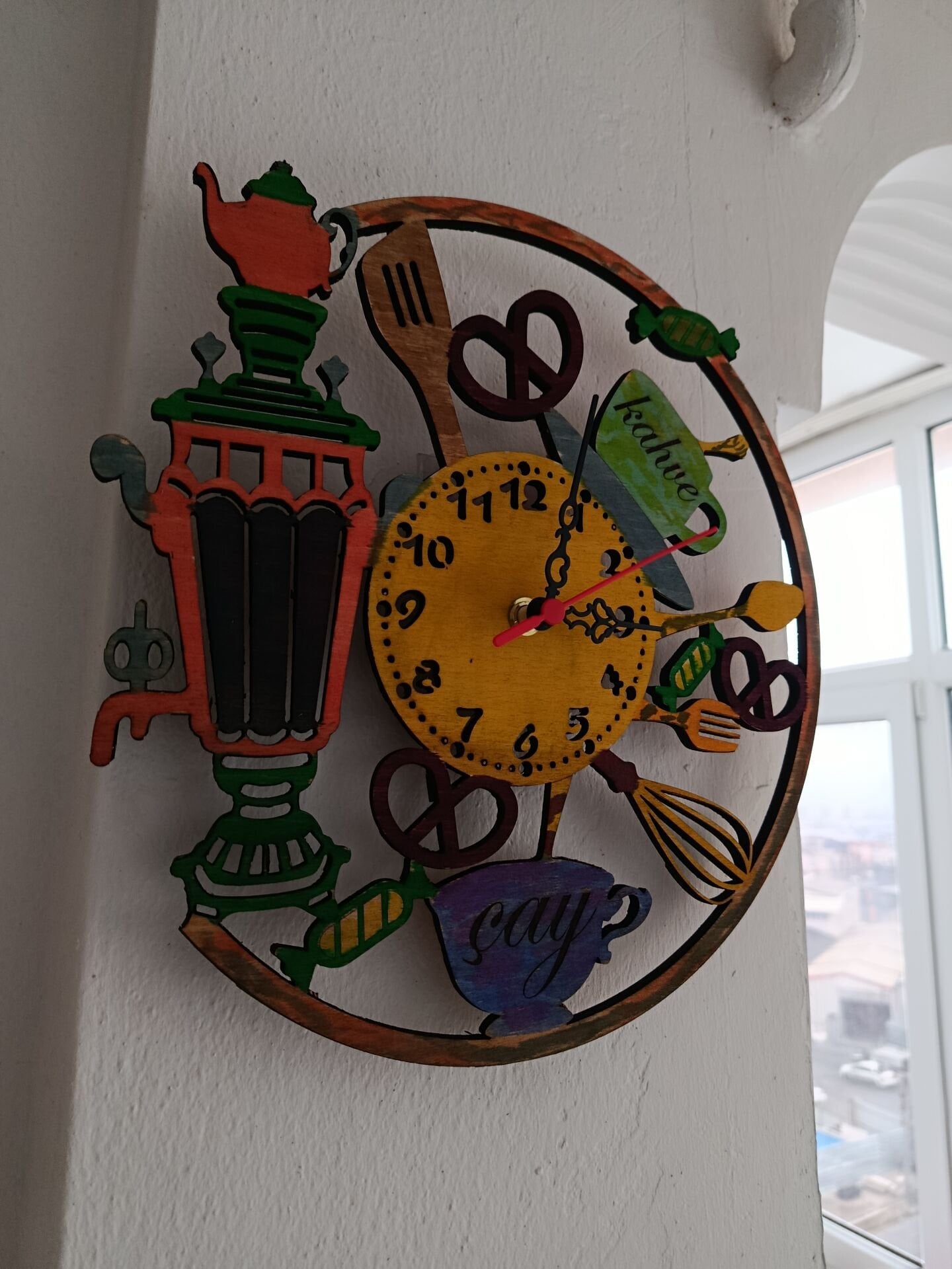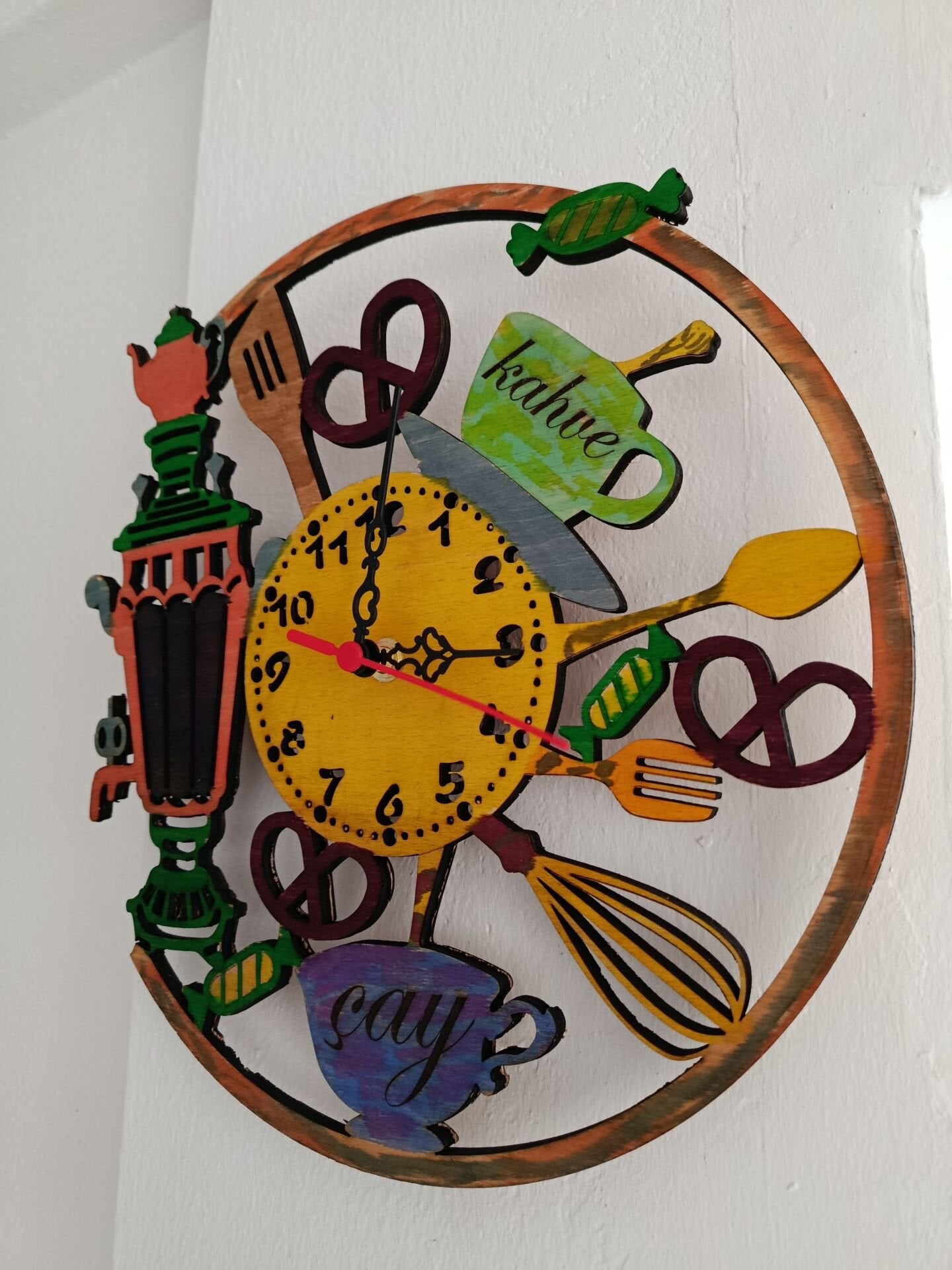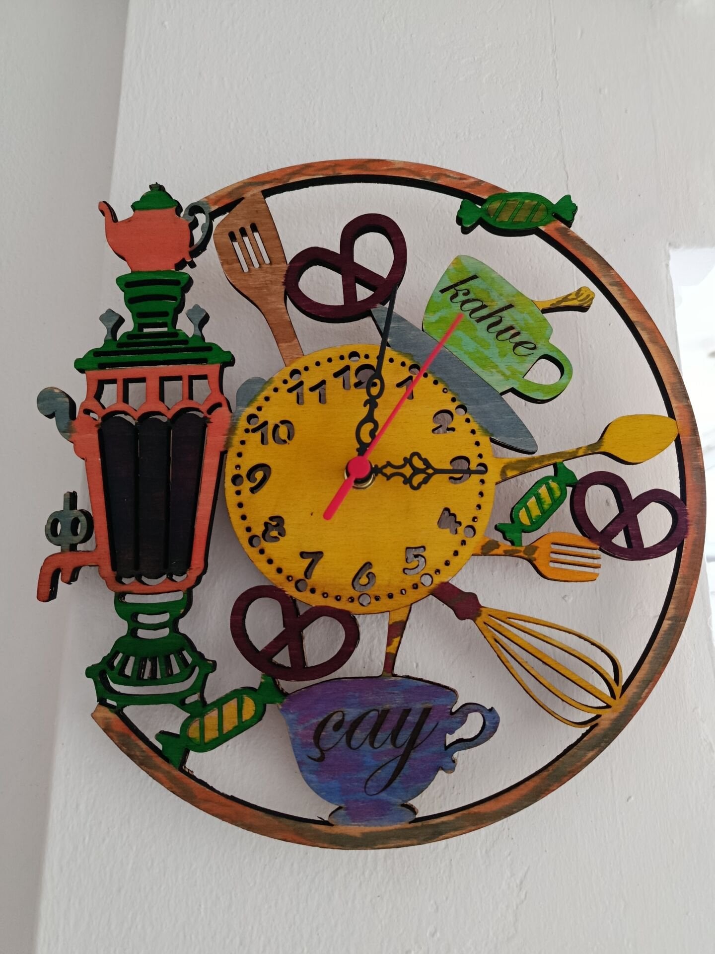 Semaver figürüyle süslenen ahşap duvar saati, mutfağınıza sıcaklık ve şıklık katar. Lazer kesim detayları sayesinde zamansız ve estetik bir görünüm sunar. Hem dekoratif hem işlevsel olan bu saat, keyifli mutfak anlarınızı tamamlar. Kaliteli malzemesi uzun ömürlü kullanım sağlar.