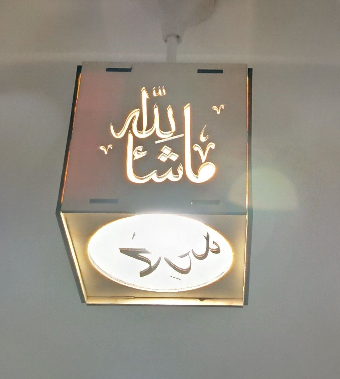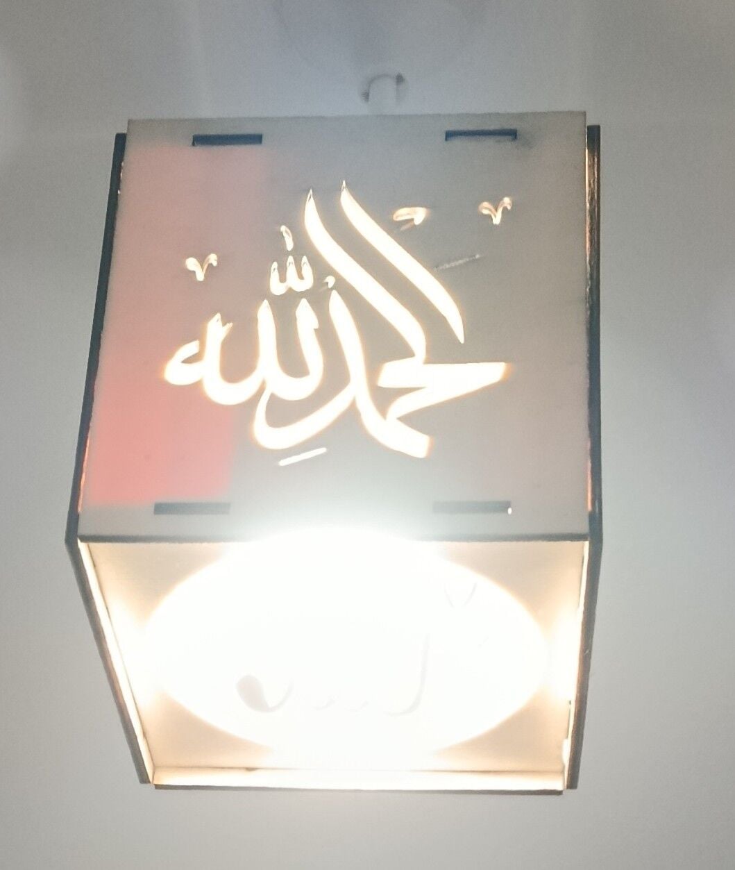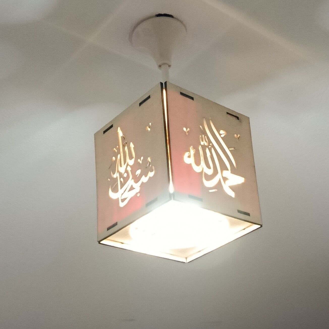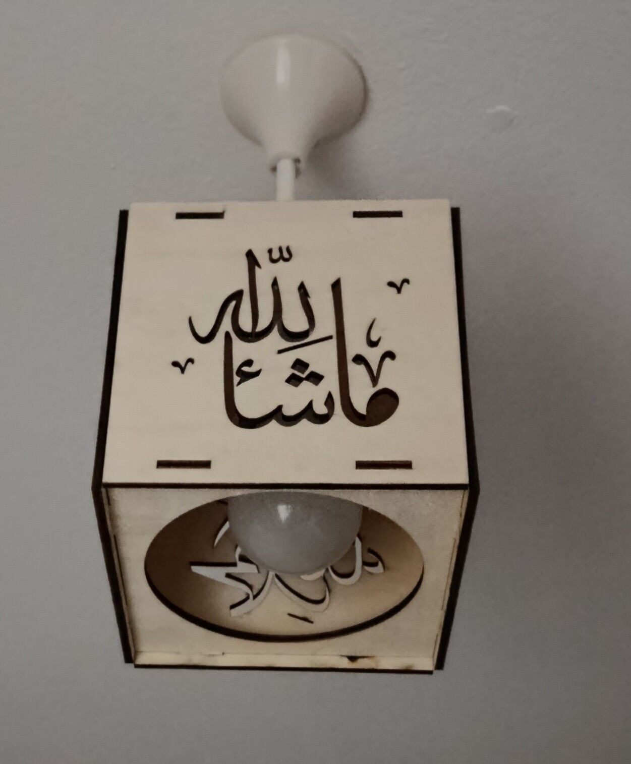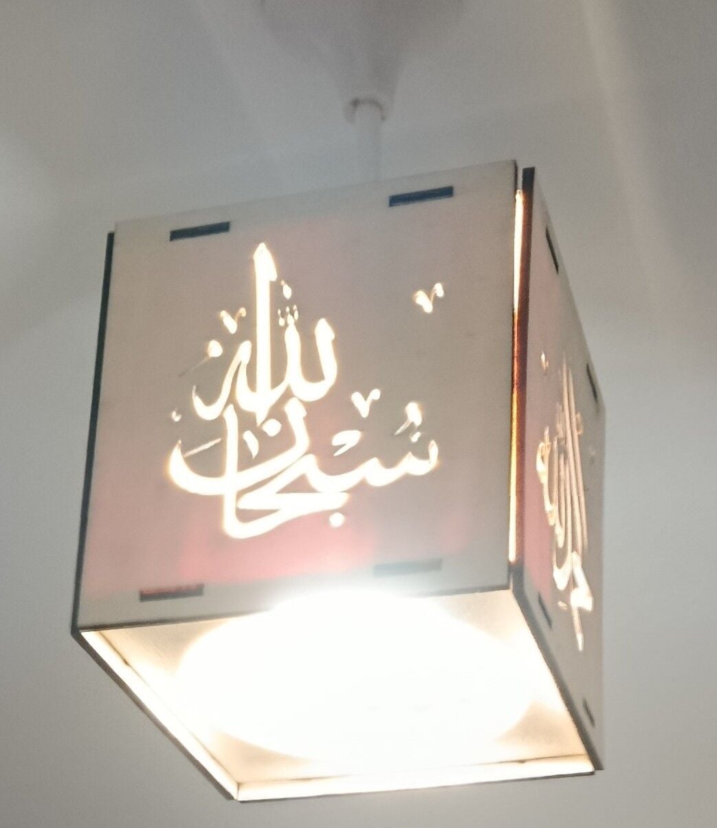 Ahşap 6mm kontraplak lazer kesim tesbihat / Sübhanallah. Elhamdülillah. Allahü ekber / ve maşallah yazılı lambalık. Tavan duylarıyla uyumlu rahatlıkla takılabilecek zarif ve odanıza, işyerinize, mutfağınıza asabileceğiniz lambalık.